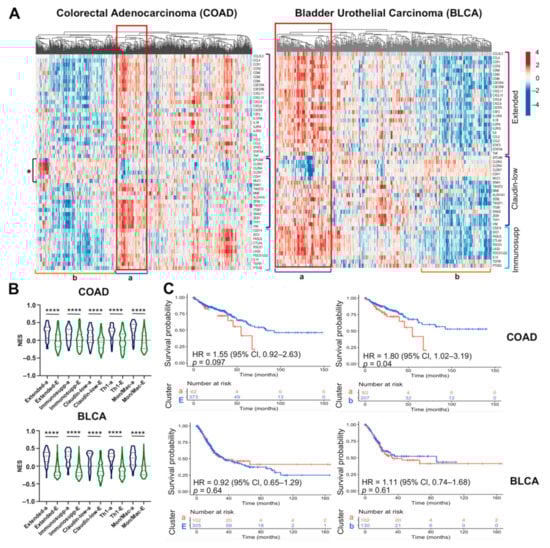 A claudin-low subtype is present in colorectal and bladder carcinomas. (A) Heatmap and (B) NES of the M1-like macrophage extended, immunosuppressive, claudin-low (the lost of claudins and other epithelial markers is indicated by *), Th1, and monocyte/macrophage gene signatures in patients with COAD (n = 435) and BLCA (n = 407). The Mann–Whitney-Wilcoxon test was used to compare NES between the cluster positive to all signatures (a) vs. remaining samples (E). (C) Kaplan–Meier survival curves were performed with COAD and BLCA samples. We made two comparisons, the cluster positive (one SD above the median value of NES) to all signatures (a) vs. remaining samples (E) (left plot) or vs. samples with one SD above the median value of NES to all signatures (b) (right plot). p-values were calculated using the Log-Rank test and the hazard ratios (HRs) were determined with 95% confidence intervals (95% CI). Immunosupp: Immunosuppressive, Mon/Mac: Monocyte/Macrophage, NES: Normalized Enrichment Score, SD: standard deviation. **** p < 0.0001.