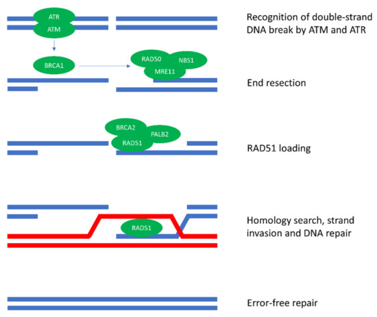 Homologous recombination repair (HR). HR commences with the recognition of double-strand DNA breaks by ATM and ATR. ATM and ATR activate BRCA1, which plays a key role in the recruitment of repair proteins needed for DNA end resection. DNA end resection generates a long 3′ single-strand DNA tail that can invade the homologous DNA strand (sister chromatid). After end resection, RAD51 is loaded on the single-strand DNA tail with the help of BRCA2 and PALB2. The strand then invades the homologous DNA strand where the actual DNA repair is performed. Since a sister chromatid is used as a template for DNA repair, HR is considered a relatively error-free process. Of note, besides the proteins depicted here, many other proteins are involved in HR.
