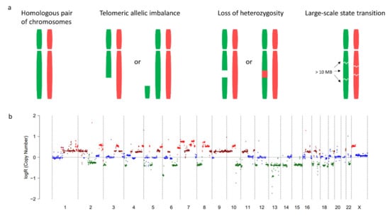 The genomic instability of HRD tumors not only leads to a higher TMB, but also to large structural changes that result in a gain or loss of part of a chromosome. Research in breast and ovarian cancer identified three genomic signatures characteristic for HRD, which may result in copy number variations (CNVs). These include telomeric allelic imbalance (TAI) [34], loss of heterozygosity (LOH) [35], and large-scale state transitions (LST) [36] (Figure 3). Furthermore, the presence of ~10 kb duplications is specific for BRCA1-mutated tumors but not for other HRD tumors (Figure 2) [5,37].