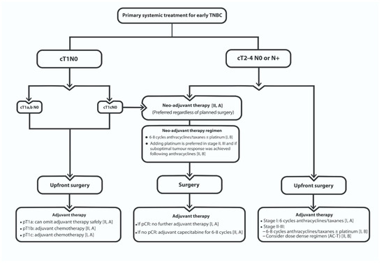 | In the presence of pCR after NAT (anthracylines/taxanes) for TNBC, no further adjuvant systemic therapy is advised. | 93% | II | A |