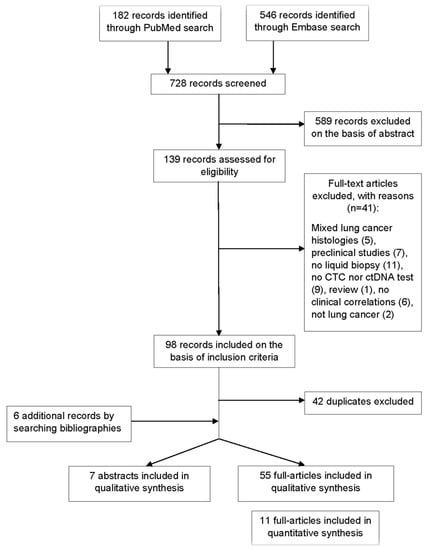 A total of 728 records were screened to be included in the systematic review (Figure 1). According to selection criteria, we identified 56 records found through database searching (PUBMED and EMBASE) and 6 records by searching bibliographies. As a result, 62 records were eligible and included in the systematic review: 55 full-text articles studies and 7 abstracts presented at international congresses. Fifteen studies concerned transformed SCLC. Overall, identified records included mainly clinical trials with exploratory endpoints assessing the value of LB, observational studies, and case series or case reports for transformed SCLC. A total of 32 studies evaluated CTCs, 27 studies evaluated the role of circulating DNA, and 3 studies explored both (Tables S1 and S4).