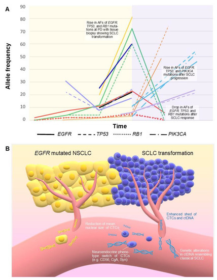 Our group and others described cases of patients with progressive NSCLC under TKI treatment with evidence of sharp elevation of AF of EGFR activating mutation in ctDNA measured with ddPCR, concurrent with evidence of histologic transformation to SCLC [64,65,66]. Performing NGS on ctDNA, other researchers also reported a significant elevation in EGFR mutation AF concomitant with the increase in AF of TP53, RB1, or PIK3CA alterations before or at the moment of the histologic transformation, after TKI failure [67,68,69,70,71]. A subsequent reduction in the allelic abundance of these mutations after an SCLC-directed treatment has been reported, as well [69,70]. Two groups presented data supporting the utility of ctDNA in detecting the EGFR resistant mutation T790M even after SCLC transformation, uncovering the spatial heterogeneity of the tumor [72,73], while one group described the disappearance of acquired G1202R ALK mutation, concurrent with SCLC transformation [74]. We also found two studies demonstrating that CTC phenotyping and single-cell CTC sequencing could suggest a histologic transformation. Ni et al., through a single-cell exome sequencing, identified EGFR, PIK3CA, RB1, and TP53 mutations in CTCs of a patient with transformed SCLC, with higher abundance than in the original NSCLC [75]. More recently, a Chinese group applied a new assay allowing rapid CTC isolation with different aptamers and characterization by immunocytochemistry. They firstly reported a significant reduction in mean nuclear size and a phenotype shift of CTCs concurrent with SCLC transformation in 14 patients [76] (Table 3).