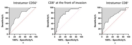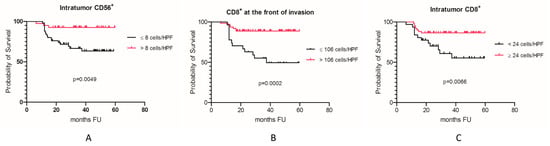 | Variable | CD56+ Intratumor | p-Value | CD8+ Front of Invasion | p-Value | CD8+ Intratumor | p-Value | ||||