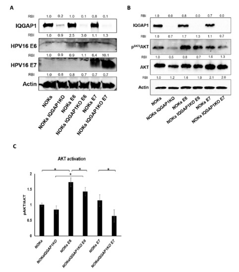 Multiple reports described relationships between high-risk HPV oncoproteins, E6 and E7, and PI3K signaling, but the findings varied [46,47,48]. Therefore, we first examined whether HPV16 E6 and E7 regulate PI3K signaling in human keratinocytes, the natural host cells for papillomavirus infection. We used lentiviral transduction to introduce HPV16 E6 and E7 into normal oral keratinocytes (NOKs), which are hTert-immortalized human gingival epithelial cells [39]. To study the role of IQGAP1, the IQGAP1 gene was knocked out (KO) in these cells using the CRISPR-Cas9 system. The status of IQGAP1 and HPV protein expression in these cells was confirmed by immunoblotting (Figure 1A). Utilizing these cells, we found that E6 expression significantly increased levels of pAKT, and this increase was significantly reduced in the IQGAP1 KO cells (Figure 1B,C; NOKs vs. NOKs E6, p = 0.001; NOKs E6 vs. NOKs IQGAP1KO E6, p = 0.05, two-sided t-test). On the contrary, E7 expression did not significantly induce PI3K signaling, but the absence of IQGAP1 still reduced PI3K signaling in the E7-expressing cells (Figure 1B,C; NOKs vs. NOKs E7, p = 0.34; NOKs E7 vs. NOKs IQGAP1KO E7, p = 0.03, two-sided t-test). Together, these data support the hypothesis that the HPV16 oncoproteins can increase PI3K signaling in human oral keratinocytes, in which E6 appears to have a stronger effect than E7 in inducing the signaling. In both cases, this upregulation depends on the IQGAP1 protein.
