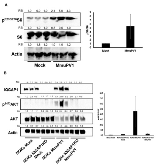 In order to investigate whether MmuPV1-induced PI3K signaling is regulated by IQGAP1, we again turned to our isogenic NOKs and NOKs IQGAP1KO cells based upon the prior observation that MmuPV1 can infect human keratinocytes [49]. We first confirmed that human NOKs and NOKs IQGAP1KO cells could be infected by MmuPV1 (Figure S1B). Both NOKs and NOKs IQGAP1KO produced similar levels of E1^E4 spliced transcripts upon MmuPV1 infection, indicating that MmuPV1 can also infect these human keratinocytes. We then infected the NOKs and the NOKs IQGAP1KO cells using the same amount of virus and quantified the levels of pAKT by immunoblotting at 48 h post-infection. MmuPV1 infection triggered PI3K signaling strongly in NOKs cells but failed to do so in NOKs IQGAP1KO cells (Figure 2B). This indicates that MmuPV1 can induce PI3K signaling upon infection in an IQGAP1-dependent manner. We also observed a downregulation of total AKT levels upon MmuPV1 infections in both NOKs and NOKs IQGAP1KO cells, the reason for which needs further exploration. Together, these data in human and mouse keratinocytes confirm that MmuPV1 induces PI3K signaling and that this signaling may depend on IQGAP1.