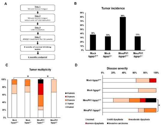 With the knowledge that MmuPV1 induces PI3K signaling in an IQGAP1-dependent mechanism in vitro, we next investigated the role of IQGAP1 in PV-associated head and neck tumorigenesis in vivo using the MmuPV1 infection model we previously established [28]. The experimental design is summarized in Figure 3A. Briefly, we wound the tongues of wild-type FVB mice (Iqgap1+/+) and the Iqgap1-knockout mice on the FVB background (Iqgap1−/−). The next day (day 2), the tongues were wound again and infected with either PBS (mock-infected) or 108 VGE of MmuPV1 (MmuPV1-infected), the same dosage found to cause tumors in our published model. All mice were treated with 1000 mJ of UVB radiation on day 3 to induce immunosuppression [38]. Starting at day 7, mice were given drinking water containing 20 µg/mL of the synthetic oral carcinogen, 4-nitroquinoline-1-oxide (4NQO) for 16 weeks, followed by 8 weeks of regular drinking water (no carcinogen). At the 6 month endpoint, mice were sacrificed, and their tongues were collected, fixed, processed, sectioned at 5 micrometer intervals, and every tenth slide was stained with H&E. The histology of the resulting tissues was assessed using the H&E-stained slides, and the disease state (normal, dysplasia, and invasive carcinoma) was scored by a trained pathologist.