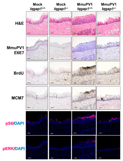 We also compared two biomarkers related to HPV-associated carcinogenesis. pS6, the active form of the effector S6 for PI3K/mTOR signaling, and phosho-ERK (pERK), the active form of the effector ERK for mitogen-activated protein kinase (MAPK) signaling, are upregulated in HPV-associated cancers according to previous reports [12,13,50,51]. In our study, both pS6 and pERK levels increased in lesions from both infected groups compared to those from mock-infected groups, indicating increased PI3K and MAPK signaling in MmuPV1-induced lesions. The infected-Iqgap1−/− mice may have qualitatively lower levels of pS6 and pERK compared to the infected-Iqgap1+/+ mice, but further studies are needed to repeat this experiment on a larger scale for quantitative analysis.