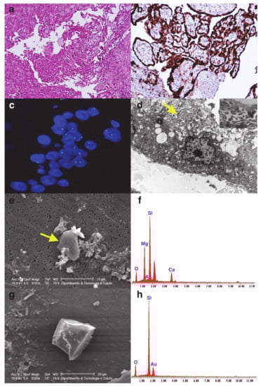 Case 1. Histological section of papillary ovarian mesothelioma ((a) hematoxylin and eosin stain, original magnification ×200). The neoplastic cells were strongly positive for calretinin ((b) immunohistochemistry, original magnification ×200). FISH analysis showed CDKN2a (p16) heterozygous deletion (c). Upon ultrastructural examination, the neoplastic cells showed microvilli-like expansion (arrow, inset) on the luminal surface ((d) original magnification ×4400; inset original magnification ×30,000). The SEM micrograph of foliated talc crystals ((e) arrow) and EDX analysis spectrum of the particle (f) were compatible with its general chemical formula (Mg3Si4O10(OH)2). SEM image of quartz crystal and EDX analysis spectrum (g,h).