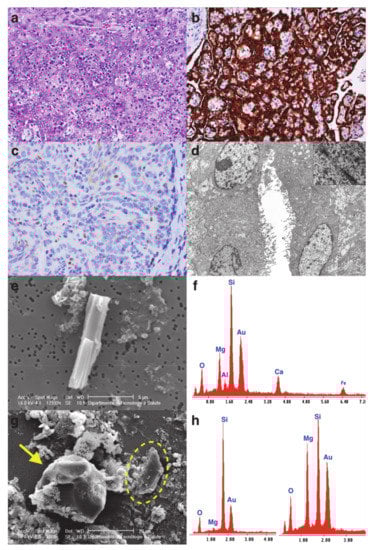 Case 2. Histological section of ovarian mesothelioma with solid and trabecular patterns ((a) hematoxylin and eosin stain, original magnification ×200) and diffusely immunoreactive calretinin ((b) immunohistochemistry, original magnification ×200). Lack of nuclear expression of BAP1 ((c) immunohistochemistry, original magnification ×400). The neoplastic cells showed numerous elongated and branching microvilli on the luminal surface ((d) original magnification ×4400). At higher magnification, desmosome-like junctions and intracytoplasmic tonofilaments were evident (inset, original magnification ×10,000). The SEM micrograph (e) and EDX analysis (f) spectrum were morphologically and chemically (chemical formula: Ca2Mg5Si8O22(OH)2) compatible with tremolite fiber. In the same specimen, quartz ((g) arrow) and talc crystals ((g) dashed lines) were also evident with the respective EDX analysis spectrum ((h left) quartz; (h right) talc crystal).