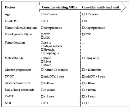 A simple check list of factors which can be potential indications for starting multi-kinase inhibitor treatment for radioactive-iodine refractory differentiated thyroid cancer. ECOG PS, Eastern Cooperative Oncology Group performance status; FTC, follicular thyroid cancer; ATC, anaplastic thyroid cancer; PTC, papillary thyroid cancer; TV-DT, tumor volume doubling time; midDT, average tumor volume doubling time; Tg-DT, thyroglobulin doubling time; NLR, neutrophil-to-lymphocyte ratio.