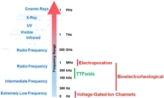 Different EMF ranges will initiate different biological effects (Figure 1). For example, low frequencies (0–300 Hz) tend to trigger membrane depolarization and consequently stimulate nerve, muscle, heart, and other tissues [2]. At the other end of the spectrum, high frequency electric fields (120 MHz) were found to result in a reversible elongation accompanied by a rotatory motion of the cells due to stress resulting from field distortions [6]. The process of electroporation (i.e., microbiology technique in which one employs a pulse of electricity to briefly open the pores in the cell membranes primarily for the purposes of DNA transduction) occupies a wide frequency range from 1 Hz to 1 MHz [7]. Intermediate frequency (100–400 kHz) alternating electric fields (AEFs), referred to as tumor treating fields (TTFields) in the context of cancer, have been studied in detail for many years [8,9,10]. These electric fields have been applied to glioblastoma, the most common and lethal form of primary brain cancer in adults [10,11]. Based on the results of a phase III clinical trial that showed 200 kHz TTFields in combination with adjuvant temozolomide chemotherapy prolonged the median overall survival (OS) in newly diagnosed GBM patients by 4.9 months (and prolonged median progression-free survival [PFS] by 2.7 months) compared to adjuvant temozolomide alone, this form of AEF therapy was approved by the U.S. Food and Drug Administration (FDA) in 2015 [11,12]. The OS benefit due to the addition of 200 kHz TTFields therapy was maintained regardless of glioblastoma patient subgroup, i.e., MGMT promoter methylation status, extent of resection (biopsy, partial, gross total), region (U.S. vs. non-U.S.), age (<65 vs. ≥65 years), Karnofsky performance score (90–100 vs. ≤80), and sex [12]. Of note, the 5-year OS rate increased from 5% to 13% in the glioblastoma patient arm receiving 200 kHz TTFields [12]. More recently, in 2019, 150 kHz TTFields received FDA approval under its humanitarian device exemption for the first-line treatment of unresectable, locally advanced or metastatic, malignant pleural mesothelioma (MPM) when combined with pemetrexed and platinum-based chemotherapy [13]. In this single-arm phase II clinical trial, the median OS and PFS were 18.2 months and 7.6 months, respectively [13], compared to corresponding historical controls of 12.1 months and 5.7 months from a 2003 phase III clinical trial evaluating pemetrexed in combination with cisplatin in MPM [14]. Of note, a randomized controlled open-label phase III clinical trial in MPM patients published in 2016 demonstrated a median OS in its control arm (pemetrexed and cisplatin) of 16.1 months [15]. The treatment of cancers by TTFields is thus a novel, validated therapy that may represent an additional paradigm (alongside surgery, radiation therapy, chemotherapy, and immunotherapy [16]) in anti-cancer treatments [17].