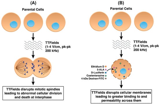 (A) Standard mechanism of action of TTFields in cancer cells by disrupting mitotic spindle formation (B) TTFields disrupting cancer cell plasma membranes resulting in increased permeability.