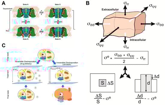 The three models that could partially explain the action of alternating electric fields (AEFs) on cell membrane integrity and function include: (A) Impact of AEFs on voltage-gated ion channels (adapted from [38,39]). (B) The bioelectrorheological model (adapted from [40]). (C) The electroporation model (reprinted with permission from ref. [41]. Copyright 2019 Springer Nature). Parameters are defined in the respective references and Tables S1–S3.