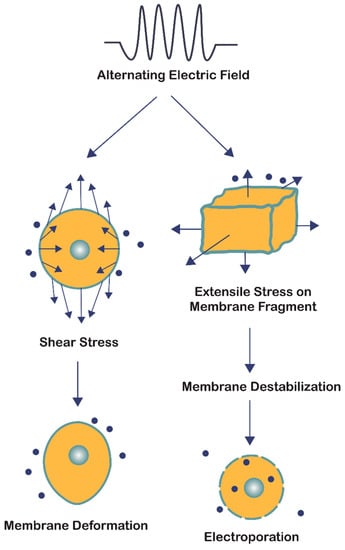 The bioelectrorheological model of the cell was proposed and has been expanded upon through a series of manuscripts by Pawlowski et al. [40,53,54,55,56,57] (Figure 3B). This model demonstrates the relationship between AEFs, shape deformations, and membrane destabilization, which can contribute to electroporation and other electric field-induced cell phenomena including electrofusion and electro-destruction. Electroporation, or electropermeabilization, is of particular interest to this review because this process can increase the permeability of the cell membrane, which would permit drugs that cannot normally gain access via the lipid membrane to enter the cells. The application of AEFs causes different types of stress to act on the cell membrane, thereby disrupting its integrity and stability. Based on electrical and geometric parameters of the system, cells either experience shear stress or extensile mechanical stress. In the bioelectrorheological framework, the cell model consists of three parts—the cytoplasm, membrane, and external medium—which are all simplified to be homogeneous wherein the cytoplasm and medium are considered as non-viscous fluids while the membrane is considered an elastic and viscous element [53,57].