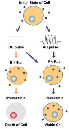 Illustration of the two main types of electroporation (direct current [DC] and alternating current [AC]) and their effects on a cell and its membrane. DC involves the use of short, individual pulses of electric charge whereas AC applies electric charge in an oscillating motion (increasing and decreasing) over a period of time. The dark blue circles represent molecules (average Stokes diameter ~20 nm [64]) that can only enter the cell through pores in the membrane. E is the electric field intensity (units V/cm) and Ecrit is the minimum field intensity required to reach the cell’s membrane potential threshold. The diagram shows how E can impact the cell’s survival depending on the type of current (DC or AC) and whether E is greater or less than the critical field intensity (Ecrit). When E < Ecrit, the effects of electroporation are reversible, and the cell remains viable.