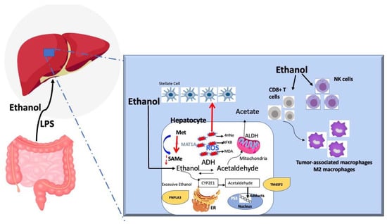 The aberrant methylation of DNA or proteins leads to the formation of cancers, including HCC. Alcohol leads to suppression of MAT1a, the main enzyme responsible for the synthesis of the main methyl donor of the liver, S-adenosylmethionine []. The MAT1a knockout mouse develops steatohepatitis, cirrhosis, and HCC []. The microenvironment surrounding the tumor also is very important. In that regard, research in HCC animal models has revealed a shift in the microenvironment surrounding HCC from CD8+ T cells to tumor-associated macrophages and M2 macrophages [,]. The immune system plays a role in the cross-talk between alcohol and HCC formation. Alcohol consumption leads to NK-cell dysfunction, which plays a role in tumor surveillance. NK cells in patients with alcoholic cirrhosis have diminished cytotoxic activity against cancers cells [,]. In addition, Toll-like receptor 4 (TLR4) identifies lipopolysaccharides (LPS) (products of gram-negative bacteria) that are usually elevated in persons with excessive alcohol intake and alcoholic cirrhosis []. TLR4 and the LPS pathway have been linked to HCC progression [,]. Finally, genetic associations between HCC development and alcoholic liver disease have been identified: patients with PNPLA3 (rs 738409) polymorphism have been linked to HCC in patients with alcoholic liver disease []. Other studies have linked the TM6SF2 polymorphism to alcoholic-related HCC, but further research is needed to confirm the genetic role of alcohol in HCC []. The Pathways involved in alcohol-mediated liver carcinogenesis are summarized in Figure 1.