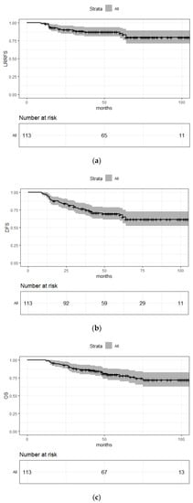 Five-year OS, DFS and LRRFS were 78% (CI: 70.1–86.8%), 68.1% (59.6–77.7%), and 85.2% (78.4–92.7%), respectively. These survival outcomes are much better than in historical cohorts, which reported 5-year OS between 50 and 65% [,,,,,].