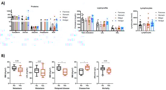 At diagnosis, most patients presented with comparable biochemical levels of serum proteins (transferrin, albumin, ferritin, prealbumin and reactive C protein (RCP)), lipids (total and fractionated cholesterol) and lymphocytes, considering the primary tumor site (Figure 1A). Additionally, the presence of metastasis at diagnosis (almost 50% of the included patients) tended to be associated with lower BMI and serum LDL cholesterol levels. Furthermore, patients with relapsed disease presented lower BMI whereas patients who were disease-free presented with higher BMI at diagnosis. Serum albumin levels also tended to be associated with increased mortality in NEN patients (Figure 1B).