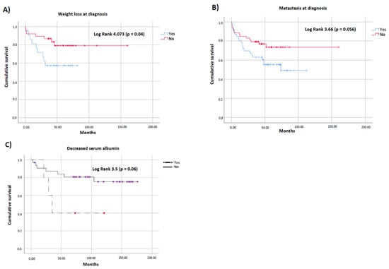 Patients who presented at diagnosis with weight loss had significantly lower overall survival compared with patients who had not presented this symptom (108 (25–302) vs. 263 (79–136) months) (Figure 2A; Supplementary Table S2A). A similar effect on survival was observed when the presence of metastasis at diagnosis was evaluated (136 vs. 245 months; p = 0.05; Figure 2B). Additionally, patients with decreased albumin at diagnosis tended to present lower overall survival compared with patients with normal serum levels (65 vs. 142 months; p = 0.06; Figure 2C). Specific data about Log Rank and IQR are presented in Supplementary Table S1A. BMI and other biochemical parameters (transferrin, ferritin, lymphocytes, RCP and cholesterol) were not associated with survival in NEN patients (Supplementary Table S2B; Supplementary Figure S1).