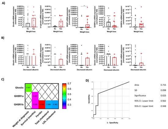 Molecular expression of ghrelin system components in NEN tumor samples according to the presence of: (A) weight loss; (B) decreased serum albumin levels; (C) significant clinical correlations between the mRNA expression of some ghrelin system components and nutrition-related parameters in NENs; (D) ROC curve representing GOAT enzyme as marker for identifying NEN patients with weight loss. **: p < 0.01.