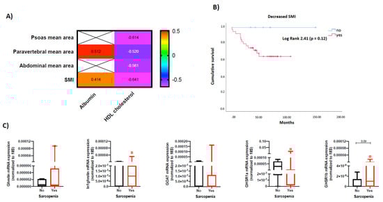 (A) Significant clinical/biochemical correlations between nutritional parameters and CT-measured muscle characteristics including SMI. (B) Cumulative survival curve for NEN patients according to the presence of sarcopenia at diagnosis using CT imaging. (C) Molecular expression of ghrelin system components in NEN tumor samples according to the presence of sarcopenia at diagnosis using CT scans.
