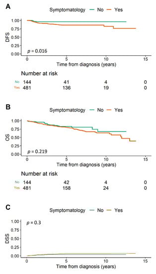 Similar prognostic factors were identified in another multicentric study of 543 postmenopausal women [20]. Seebacher et al. demonstrated that tumor stage, grade, patients’ age—but not symptomatology—were associated with disease-free (HR 0.9, p = 0.7) and overall survival (HR 0.8, p = 0.4) in multivariable analysis. Their conclusions are compatible with our results: Symptomatology was not a significant risk factor when a multivariable analysis was used (DFS—HR 2.03 (0.79–5.24), p = 0.144; OS—HR 0.72 (0.431–1.21), p = 0.216).