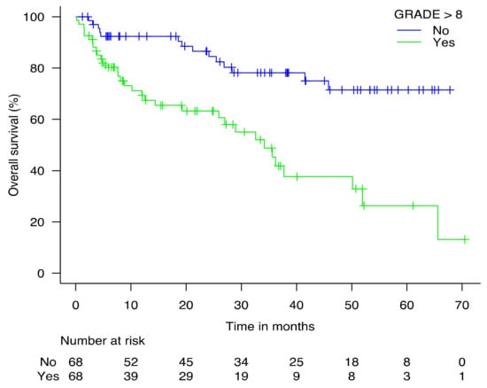 The GRADE scores ranged from 3 to 13. Patients were classified into two groups defined by the median GRADE score as follows: low-risk (GRADE ≤ 8) and high risk (GRADE > 8).