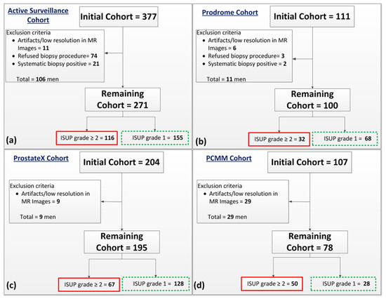Flow diagram of patient exclusion and inclusion of the four cohorts used in this study: (a) Active Surveillance, (b) Prodrome, (c) ProstateX, and (d) PCMM. ISUP: International Society of Urological Pathology.