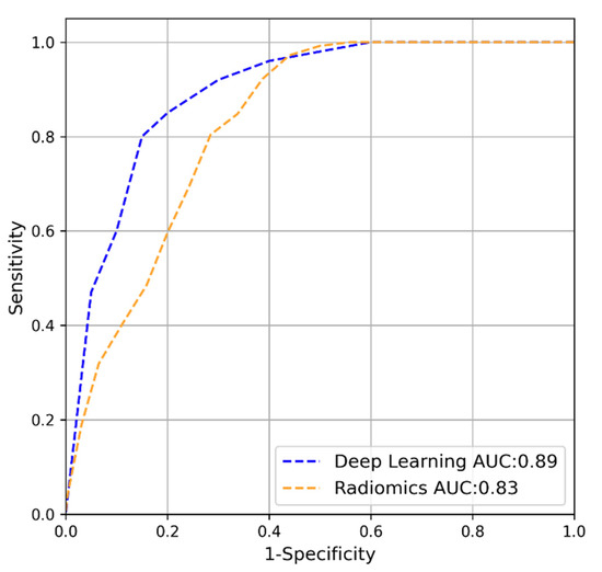 In Figure 2, the ROC curve of the deep-learning model (blue line) and the radiomics model (orange line) as computed by the internal cross-validation of the training set can be seen. Table 2 depicts the accuracy, sensitivity, specificity and F1-score obtained from this experiment. Overall, it can be seen that deep learning performed better on the training set compared to the radiomics model.
