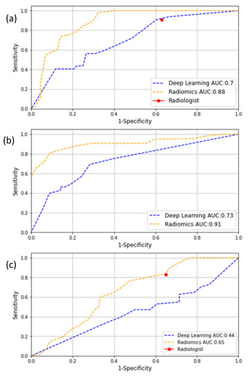The deep-learning and radiomics models obtained similar ROC curves when validated by internal cross-validation on the training set. However, when validated by external sets, the comparison showed that the radiomics model had higher AUC values than the automated deep-learning model in all data sets.