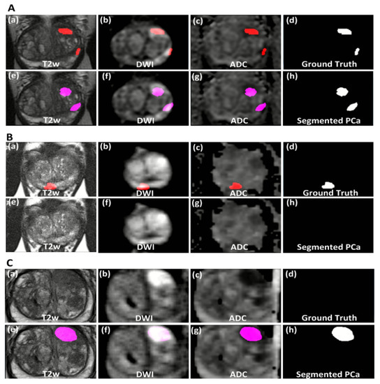 All images show the same axial slice as 2D view of mpMR images (a,e T2w images; b,f DWI b800; c,g ADC map) of the prostate with the reference ground truth (d) and the segmented PCa lesion by the deep-learning model (h) (A) Example of a true positive case (PSA = 17.6; prostate volume = 46 cc; ISUP grade = 2 (up) and 3 (down)). The ground truth is shown in overlay (red) as delineated by the radiologist and proven by targeted biopsy as significant PCa. The segmented significant-PCa lesion by the deep-learning model is shown in overlay (pink). (B) Example of a false negative case (ISUP grade = 2). The ground truth is shown in overlay (red) as delineated by the radiologist and proven by targeted biopsy as significant PCa. The deep-learning model has not segmented any PCa lesion. (C) Example of a false positive case (ISUP grade = 1). The images show no delineation due to the absence of significant PCa, the region delineated by the radiologist (not shown) proved by targeted biopsy as insignificant PCa. The lesion segmented incorrectly by the deep-learning model is shown in overlay (pink).