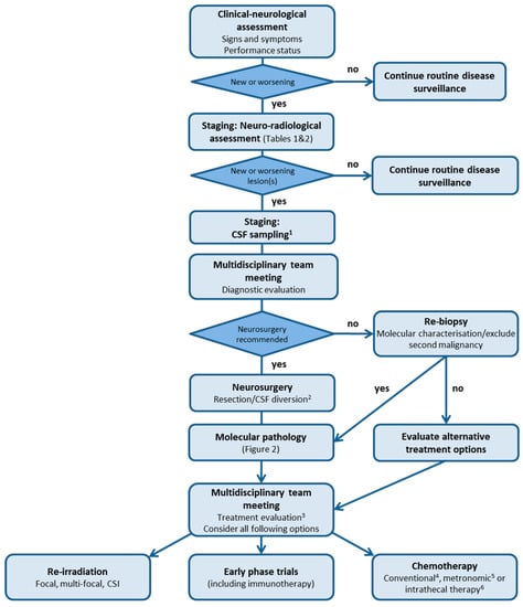 In summary, surgery should be considered to resect an isolated nodular lesion as this treatment may prolong survival, re-biopsy for the purpose of detailed pathological and molecular characterisation including exclusion of second malignancy, and palliative diversion of CSF to enhance quality of life. Importantly, re-biopsy for the purpose of molecular characterisation and exclusion of second malignancy should always be considered in experienced centres, wherever technically feasible.