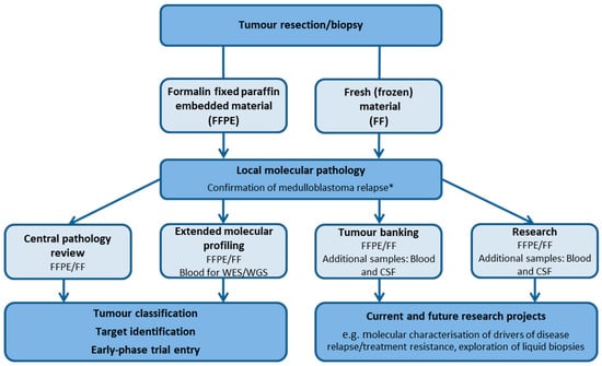 Schematic representing sample considerations following neurosurgical resection/biopsy at relapse. * Confirmation of relapse requires central pathology review and molecular profiling such as DNA methylation array as part of a central review process according to national set-up. WES, whole-exome sequencing; WGS, whole-genome sequencing; CSF, cerebrospinal fluid.