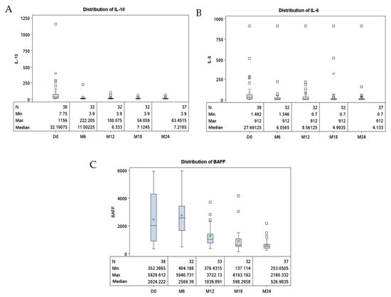 Longitudinal distribution of serum markers in HIV-positive cHL patients. Legend: Each panel represents the distribution of serum levels (pg/mL) of IL10 (A), IL6 (B) and BAFF (C) collected every 6 months during 24 months.*: mean; D: day; M: month.