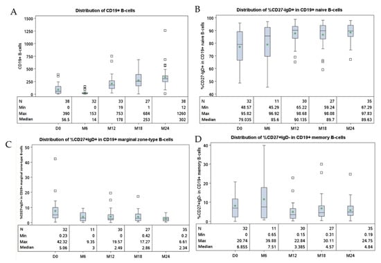 Longitudinal distribution of lymphocyte subsets in HIV- cHL patients. Legend: The panels represent the distribution of CD19+ cell counts (cells/μL) (A) and, among total B-cells, the proportions of naive (B), marginal zone type (C) and memory cells (D) collected every 6 months for 24 months starting from cHL diagnosis. *: mean; D: day; M: month.