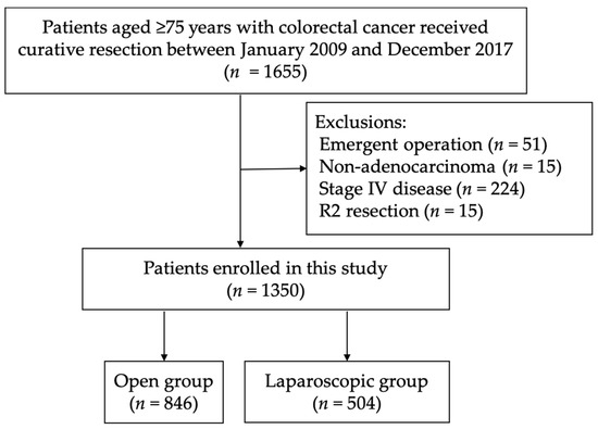 - Zeng, W.G.; Zhou, Z.X.; Hou, H.R.; Liang, J.W.; Zhou, H.T.; Wang, Z.; Zhang, X.M.; Hu, J.J. Outcome of laparoscopic versus open resection for rectal cancer in elderly patients. J. Surg. Res. 2015, 193, 613–618. [Google Scholar] [CrossRef] [PubMed]