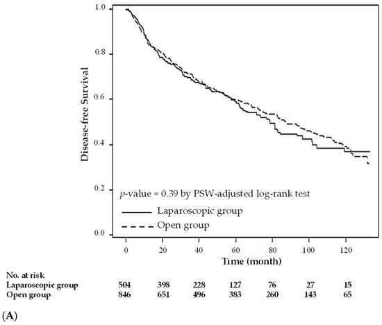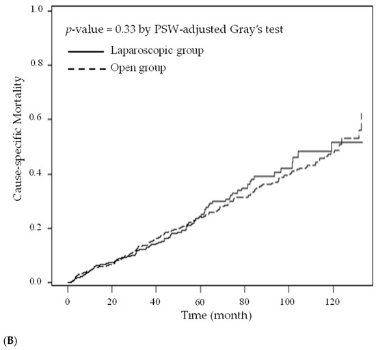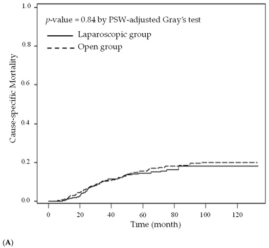 - Shigeta, K.; Baba, H.; Yamafuji, K.; Asami, A.; Takeshima, K.; Nagasaki, K.; Okamoto, N.; Murata, T.; Arai, S.; Kubochi, K. Effects of laparoscopic surgery on the patterns of death in elderly colorectal cancer patients: Competing risk analysis compared with open surgery. Surg. Today 2016, 46, 422–429. [Google Scholar] [CrossRef]