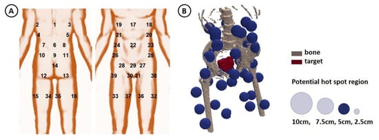 (A) Anatomical picture with all potential hot spot locations identified by a unique number, as used during clinical hyperthermia treatments. (B) 3D illustration of the spherical regions representing the potential hot spot locations, together with the bony anatomy for a cervical cancer patient. In this study, the potential hot spot diameter was varied between 2.5 and 10 cm. In this visualization a potential hot spot diameter of 5 cm is shown.