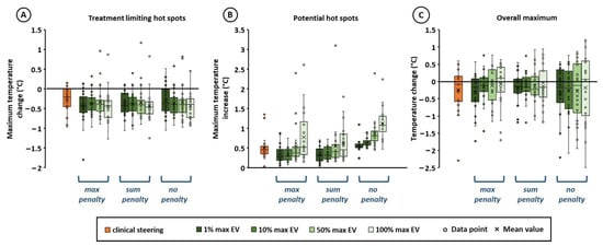 Effect of different re-optimization strategies on the predicted temperature at treatment limiting hot spot locations (A), other potential hot spot locations (B) and the overall maximum temperature (C). Results are compared to simulations for the clinically applied protocol/experience-based steering strategy during treatment. Max penalty, sum penalty and no penalty refer to the re-optimization goal functions in Equations (3), (4) and (5), respectively. To efficiently calculate a hot spot temperature during optimization, the average temperature of the voxels with the x% largest heating potential was calculated, which are the voxels with the largest maximum eigenvalues (EV) of their temperature matrix (T in Equation (2). Values of x of 1, 10, 50 and 100% were evaluated. The hot spot diameter was 5 cm.