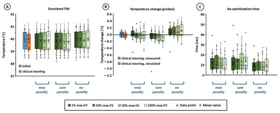 The effect of different re-optimization strategies on treatment limiting hot spot suppression as well as the maximum temperature increase at other potential hot spot locations and the overall normal tissue temperature maximum, are shown in Figure 2. The hot spot diameter was 5 cm. The effect of the clinically applied steering strategy by experienced treatment operators, is also shown. We observed that effective treatment limiting hot spot suppression was predicted for all strategies, which is, with exception of a few outliers, equally effective as the clinical strategy (Figure 2A). The difference in predicted mean hot spot temperature change compared to the clinical strategy was less than 0.2 °C for all strategies, and the standard deviation differed less than 0.1 °C. Considering the individual difference in predicted hot spot reductions between planning-based and clinical strategies for all 22 hot spots and steering actions, we see that the overall mean difference is −0.1–−0.2 °C (±0.3–0.4 °C). This indicates a mild trend that planning-based steering yields a slightly larger reduction in hot spot temperature. However, since real and predicted temperature changes might deviate ±0.1 °C [] and small differences might not be perceptible by the patient, this difference is not considered clinically relevant and planning-based and clinical strategies are considered equally effective. Although hard constraints were applied to other potential hot spot locations to avoid inducing new hot spots, adding a penalty term was an effective strategy to further avoid a large temperature increase at other locations (Figure 2B,C). Both penalties in goal function (3) and (4) were effective. As expected, the risk of insufficiently suppressing the treatment limiting hot spot and/or inducing new hot spots increased when a larger number of voxels was included to determine the average hot spot temperature. In case voxels with the 50% or 100% largest heating potential were used (50% max EV and 100% max EV), this averaging often underestimates the hot spot temperature and a higher temperature increase at other potential hot spot locations was observed and the risk of outliers increased (Figure 2A,B). These outliers represent the limited number of cases where the average temperature estimating the hot spot temperature in the model, deviated largely from the real maximum temperature in the hot spot region. The fact that there are few outliers with a large temperature increase indicates that this averaging strategy to realize fast calculations works well, especially when only those voxels with the largest heating potential are included (i.e., 1% and 10% max EV). In those cases, and when including penalty terms, the average difference in predicted maximum potential hot spot increase and overall maximum temperature change compared to the clinical strategy was less than 0.15 °C (and with a comparable spread), which is not a clinically relevant difference and thus the strategies can be considered equally effective.