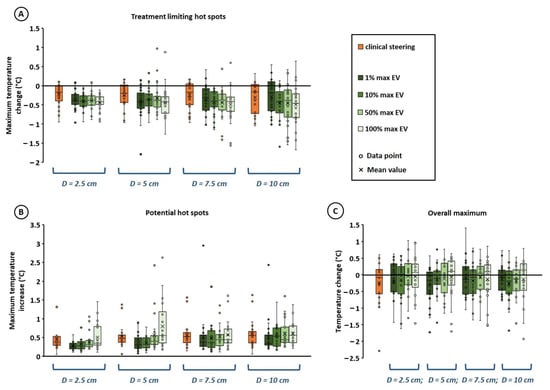 Thus, based on the results summarized in Figure 2 and Figure 3, an objective function including a penalty term would be most effective. Next, the influence of the hot spot diameter was evaluated for the most effective strategy. Both a penalty term for the maximum temperature increase in all potential hot spots (Equation (3)), and the sum of the increase in potential hot spot temperatures (Equation (4)) were effective, with no clearly pronounced difference. However, Equation (3) was selected for further evaluation, since Figure 3B shows a weak trend that using Equation (4), temperatures along the thermometry probe decrease slightly, and since the risk of not finding a solution was slightly lower in case of Equation (3). The potential hot spot diameter was varied between 2.5, 5, 7.5, and 10 cm and Figure 4 shows the effect of different re-optimization strategies on treatment limiting hot spot suppression as well as the maximum temperature increase at other potential hot spot locations and the overall normal tissue temperature maximum. Again, it was observed that the risk of insufficiently suppressing the treatment limiting hot spot and/or inducing new hot spots increased when a larger number of voxels was included to determine the average hot spot temperature (50% max EV and 100% max EV). No pronounced effect of the diameter was observed. When using 1% max EV or 10% max EV, the average predicted decrease in treatment limiting hot spot temperature deviated less than 0.2 °C from the clinical steering strategy, and the standard deviation differed less than 0.1 °C, for all hot spot diameters. Similarly, the average maximum increase in other potential hot spot locations deviated less than 0.2 °C from the clinical steering strategy, and the standard deviation differed less than 0.15 °C. The overall mean maximum temperature change deviated less than 0.1 °C from the clinical steering strategy, and the standard deviation differed less than 0.25 °C. As observed also in Figure 2, there is a mild trend that planning-based steering yields a slightly larger reduction in hot spot temperature. However, since real and predicted temperature reductions might deviate ±0.1 °C [] and small differences might not be perceptible by the patient, these small differences are not considered clinically relevant and thus the strategies can be considered equally effective.