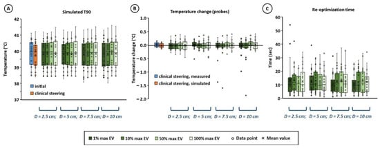 Effect of potential hot spot diameter (D = 2.5, 5, 7.5 or 10 cm) on the simulated T90 (A) and on the temperature change along the thermometry probes (B), when using a re-optimization goal function with a penalty term for the maximum increase in all potential hot spot temperatures (Equation (3)). The re-optimization calculation time is indicated in (C) for an Intel Xeon® E5-1650 v3 3.5 GHz running CentOS 6.8. Results are compared to simulations for the clinically applied protocol/experience-based steering strategy during treatment (A,B), as well as to probe measurements (B). To efficiently calculate a hot spot temperature during optimization, the average temperature of the voxels with the x% largest heating potential was calculated, which are the voxels with the largest maximum eigenvalues (EV) of their temperature matrix (T in Equation (2). Values of x of 1, 10, 50 and 100% were evaluated.