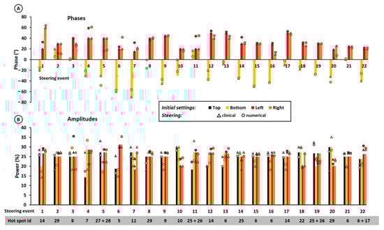 Similarities were observed in the steering strategies, when comparing clinically applied phase-amplitude settings with numerically re-optimized settings. Clinical steering for hot spot suppression predominantly uses amplitude steering while keeping phases quite constant to maintain a focus at the target location. Numerically achieved re-optimized settings generally also prescribed amplitude steering. For amplitude steering, a similarity in steering direction was also observed in many cases, i.e., when an amplitude was increased or decreased in clinical steering, numerical optimization also resulted in increase/decrease, albeit with different amplitudes. Figure 6 shows clinically applied phase-amplitude adjustments and numerically re-optimized settings for a potential hot spot diameter of 5 cm, using a re-optimization goal function with a penalty term for the maximum increase in all potential hot spot temperatures (Equation (3)) and using voxels with the 10% maximum heating potential to calculate the hot spot temperature (10% max EV).