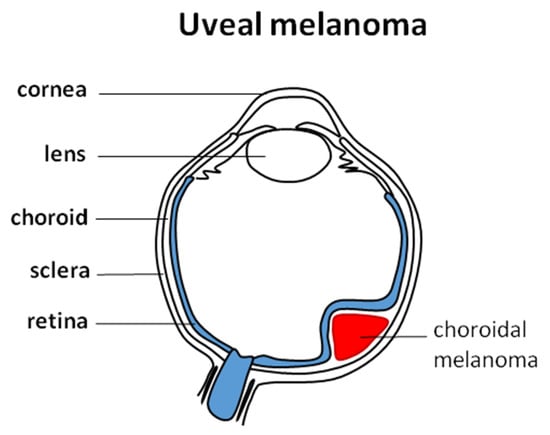 Uveal melanoma (UM) is the most common intraocular malignancy and arises from melanocytes in the choroid (90%, Figure 1), ciliary body (6%), or iris (4%) []. In UM, the median age at diagnosis is 62 years; congenital or infantile melanoma is rare and is not common in children [,]. It is a disease with a poor prognosis as in the metastatic setting; expected overall survival is no longer than 12 months []. In Europe, UM incidence increases with latitude and ranges from 2/106 in Spain and Italy, 4–6/106 in Central Europe, and >8/106 in Denmark and Norway. Worldwide UM incidence is 1–9/100,000 []. Around 50% of patients with UM will develop metastasis regardless treatment with average survival time of 6–12 months [,].