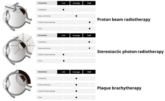 Photon-based SBRT is also a viable treatment option for uveal melanoma; however, it has been less investigated than BT and CRT. The indisputable advantage of SBRT is the broad accessibility to this technique based on linear accelerators available in the majority of RT departments. The most common fractionation regimen comprises between 50 and 70 Gy given in five successive fractions. Despite much less extensive experience with SBRT for uveal melanoma than for other RT methods, data regarding local efficacy seem to be equivalent. However, SBRT is linked with a higher risk of late complications than BT and PT [].