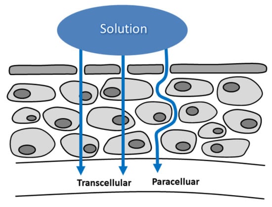 An illustration of electrically enhanced drug delivery. The applied drug may be transported either paracellularly or transcellularly.