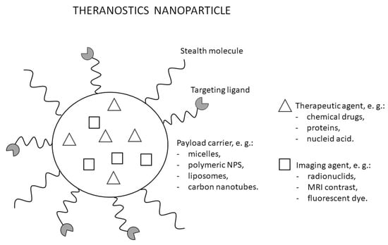 Theranostics is a field that strongly benefits from the fast development of nanomedicine. Nanoparticles (NPs) offer multifunctionality as they can integrate a few imaging or therapeutic agents and enhance circulation time in the blood. Additionally, by controlling the size and shape of NPs, different demands of biological systems can be met [,]. Theranostics NPs are engineered in several ways, e.g., by encapsulating therapeutic and imaging agents in platforms such as micelles and polymeric NPs, or by loading therapeutic agents into existing imaging NPs such as gold nanocages and iron oxide NPs, or quantum dots. Theranostics NPs surface is also modified with specific targeting ligands and polyethylene glycol to allow active tumor targeting and improve the blood circulation half-life []. However, many limitations still exist, including costs and toxicity (e.g., impairment of mitochondrial function, DNA damage) that must be studied and evaluated before introducing theranostics NPs in everyday clinical practice [,].