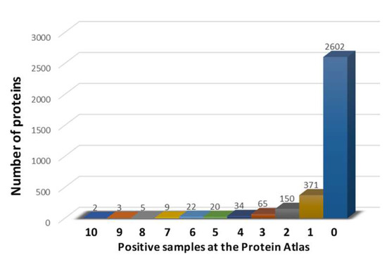 In order to identify proteins specifically overexpressed in HCC and not detected in normal liver cells, the Normal Tissue dataset, available at the Human Protein Atlas (https://www.proteinatlas.org/about/download (accessed on 15 February 2021)), was searched. More than 15,000 proteins were screened, and 5446 of them were found not detected in hepatocytes and bile duct cells of normal liver. In order to evaluate if and which of those proteins were expressed in liver tumors, the Pathology dataset was analyzed, and a total of 3283 proteins were found to be expressed in the liver tumor samples, at different levels. In particular, only a discrete number of such proteins showed high expression in more than one sample of the Protein Atlas (310, 9.45%), while the vast majority of them showed high expression in one or no sample at all (2973, 90.55%) (Figure 1). To verify the tumor-specificity of such proteins, the Normal Tissue dataset was reexamined to exclude the expression of these 310 proteins in all other normal cells. The analysis identified 40 proteins with different expression levels in HCC that were absent in all normal tissues (HCC-specific proteins = HSP). Of these, 16 proteins were found to be expressed by immunohistochemistry (IHC) in all HCC samples at the Human Protein Atlas database, with a medium/high expression in 87.17% of samples on average (min 50%–max 100%). The remaining 24 proteins were not detected by IHC in a percentage of HCC samples, ranging from 8.33% (1/12) to 50% (6/12) (Table S1).