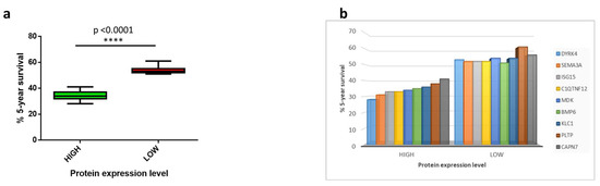 Survival analysis was performed for each of the selected 40 HSPs in order to identify those which are associated with an unfavorable prognosis in HCC patients (p < 0.05). A total of nine proteins were identified with such a characteristic (HSP associated with poor prognosis = HSP-pp) (Table 1). The five-year survival in HCC patients with high expression of each of the nine HSP-pp ranged from 28% to 41%. Considering the high expression of all nine HSP-pp, the average five-year survival in HCC patients was 34.33%, compared with 53.88% in HCC patients with low expression (Figure 2a). In particular, the worst prognosis was associated with the high expression of DYRK4 protein, with a delta of 25 percentage points (28% vs. 53% at low expression). On the other extreme, the best prognosis was associated with the high expression of CAPN7 protein, with a delta of 15 percentage points (41% vs. 56% at low expression) (Figure 2b,c).