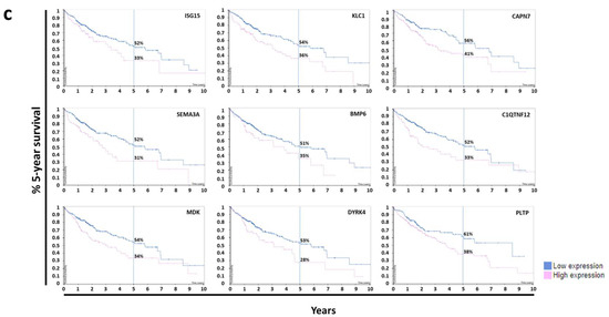 Survival analysis was performed taking advantage of data at the pathology section of The Human Protein Atlas (https://www.proteinatlas.org/humanproteome/pathology (accessed on 15 February 2021)). Only proteins whose high expression was correlated with poor survival rate (p < 0.05) were selected for subsequent analysis.